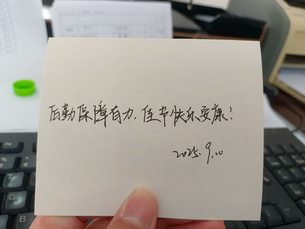 后保党总支还组织工作人员为工作岗位上的职工赠送节日贺卡送上教师节祝福。他们手持写满祝福的贺卡,逐一走访后勤集团、williamhill威廉希尔官网、总务处,向值守在工作岗位上的职工致以节日问候。收到这份意外的节日祝福,各部门的教职工倍感温暖与惊喜。他们纷纷表示,要更加积极努力工作,为学校建设和发展贡献更大力量。