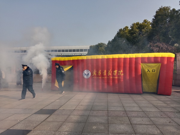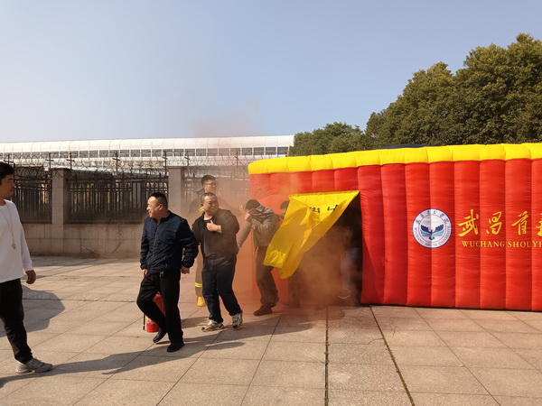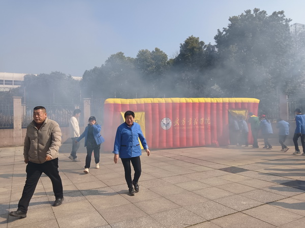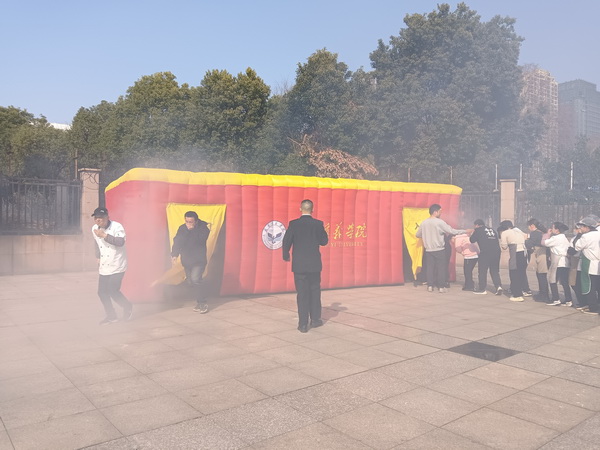 实操演练环节在计算机楼广场分区域有序开展。在“逃生仓模拟体验区”,参训人员依次进入充满模拟烟雾的充气逃生舱,在视线受阻、浓烟弥漫的环境中,弯腰捂鼻、摸索前行,真实感受火场逃生的紧张氛围,切实掌握低姿逃生、方向辨别等关键技能。