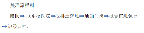接报后立即启动应急响应,协调校医院、巡逻班、门岗联动;同时向总值班领导报告情况,随时向总值班汇报进展;事件处理完毕后形成完整记录。