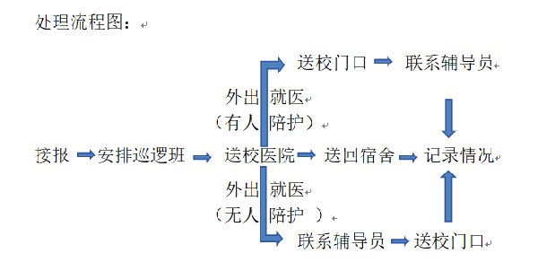 安排巡逻班5分钟内抵达学生宿舍楼,护送学生到校医院就医;若需校外就医,需登记陪护人信息,报告110指挥中心,并同步通知辅导员跟进处理。